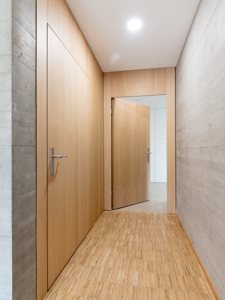 Pour cette référence à Gumefens, nous avons réalisé des portes intérieures en chêne, des portes à pivots EI30, un vitrage EI60 et des gaines techniques EI30/RF1 ainsi qu'un garde-corps RF1.